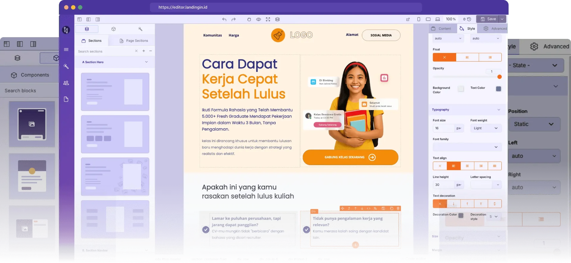 Fokus Konversi (ada CTA dan ruang testimoni)